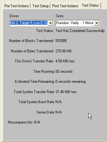 drive tested (vendor, product, firmware version, blocksize, capacity,